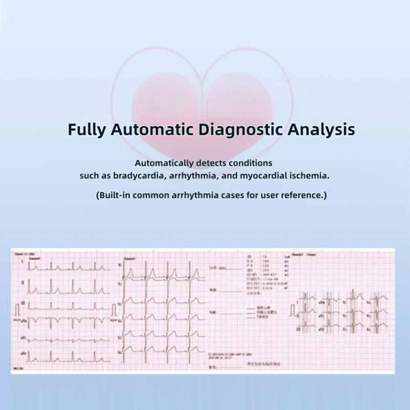 3. Vores HTSY® elektrokardiograf er udstyret med automatisk pulsmåling og intelligente analysefunktioner, hvilket gør den særdeles velegnet til daglig klinisk diagnose. Den bruger professionelt klinisk testet elektrokardiogram analysealgoritmer, som præcist kan fange de subtile ændringer i hjertets elektriske signaler, automatisk identificere forskellige unormale elektriske hjertesignaler, hurtigt give nøjagtige resultater af pulsmålinger og en komplet foreløbig analyserapport, hvilket eliminerer behovet for medicinsk personale til manuelt at beregne og analysere bølgeformer. Derudover indeholder maskinen på forhånd forskellige typiske tilfælde af almindelige kliniske arytmier, hvilket letter medicinsk personale til at få adgang til og henvise til dem når som helst under diagnosen, og hjælpe dem med at foretage mere præcise vurderinger om patientens tilstand.