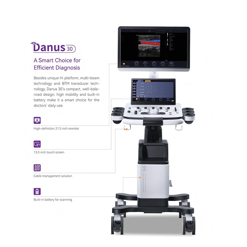 Ultralydsmaskine er et smart valg til effektiv diagnose. Udover den unikke Hi-platform, multi-beam teknologi og BTM-transducerteknologi, Danus 30's kompakte, velafbalancerede design, høje mobilitet og indbyggede batterimærke det er et smart valg til lægernes daglige brug.